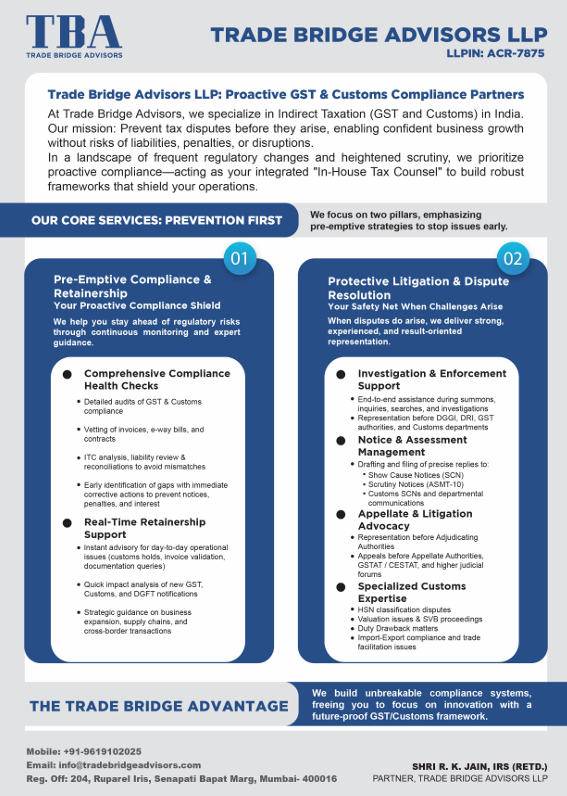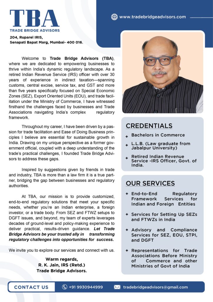 At Trade Bridge Advisors (TBA), we help businesses navigate India’s complex regulatory landscape with confidence. Founded by Shri R. K. Jain, IRS (Retd.), TBA bridges the gap between businesses and regulatory authorities, offering tailored solutions for SEZ, EOU, STPI, FTWZ, BIS and DGFT frameworks.